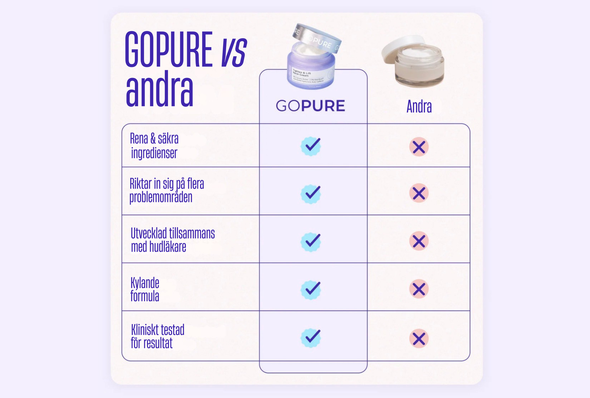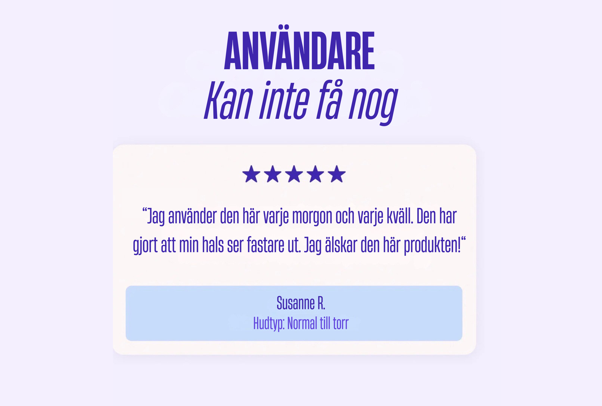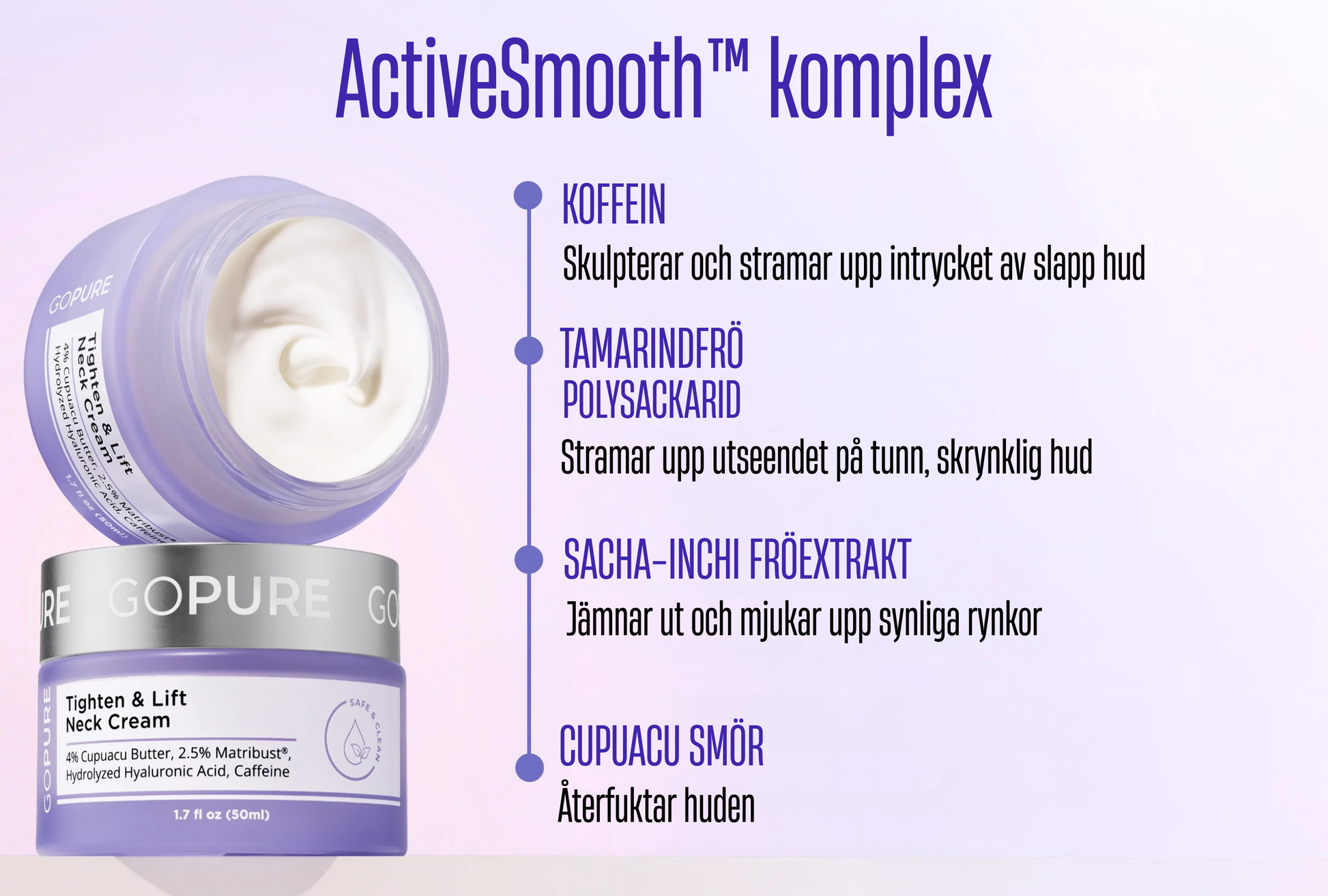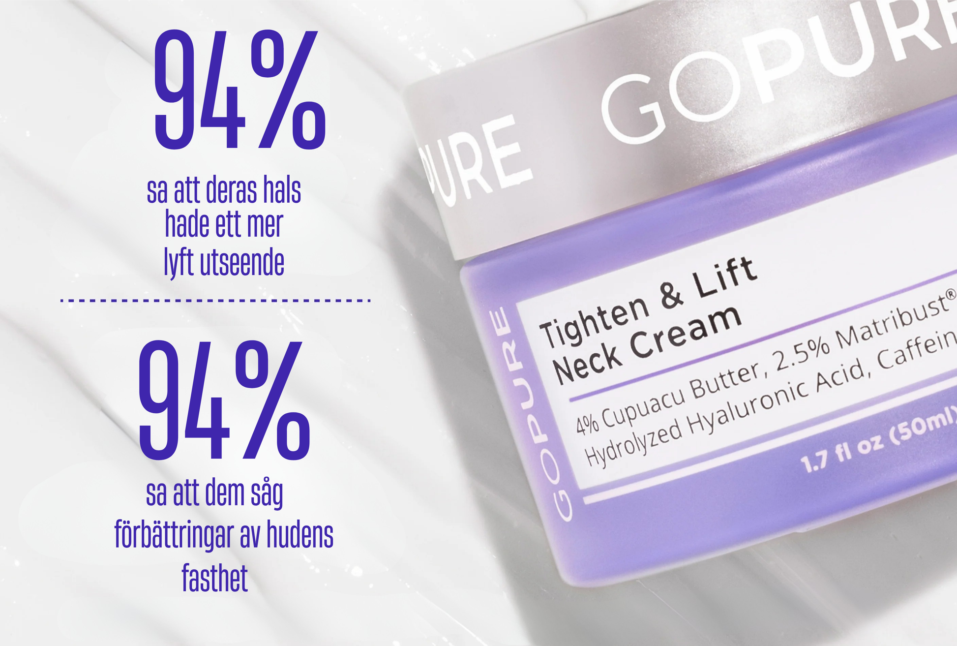 Ditt ansikte ser fantastiskt ut, men din hals har horisontella linjer, slapp hud och veck som direkt avslöjar din riktiga ålder. Kontrasten mellan ditt välvårdade ansikte och din åldrande hals är frustrerande. GoPures kliniska formula riktar specifikt in sig på halsens slapphet, jämnar ut linjer och lyfter lös hud så att den matchar ditt ungdomliga ansikte.